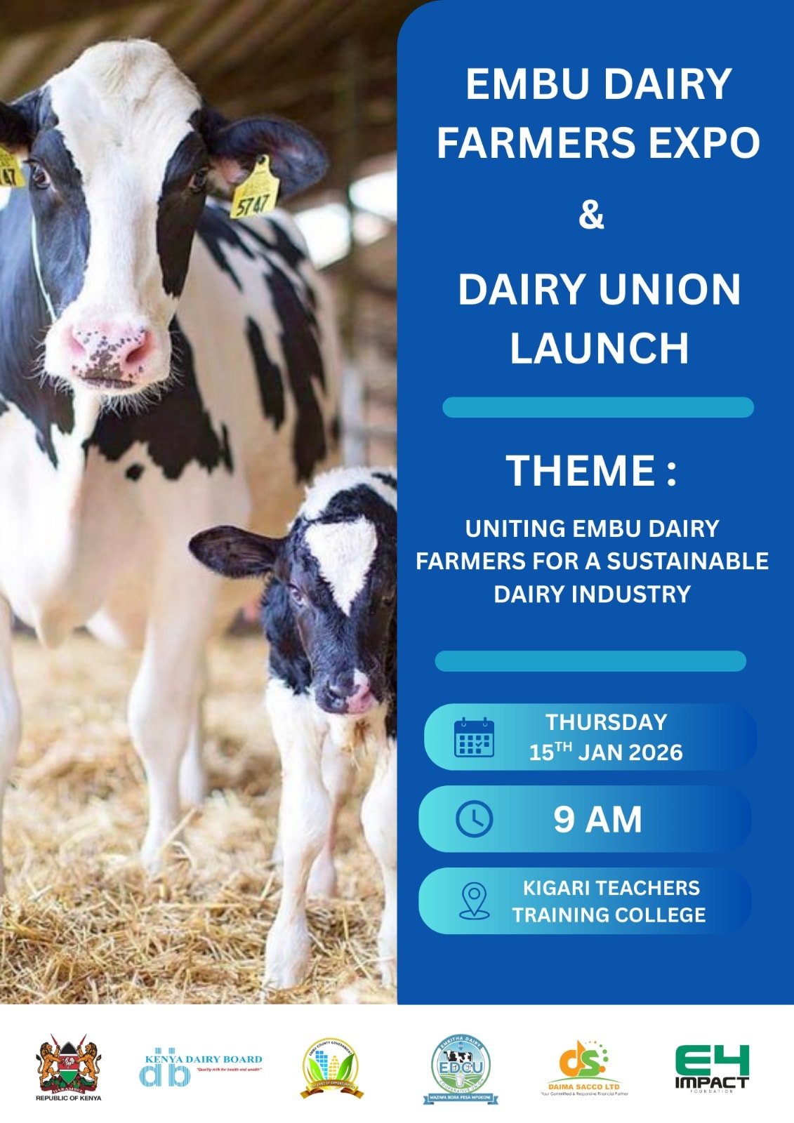 The Embu Dairy Farmers Expo and the launch of the Embu Dairy Union will take place at Kigari Teachers Training College grounds from 9 a.m., with organizers calling on stakeholders to turn up in large numbers.