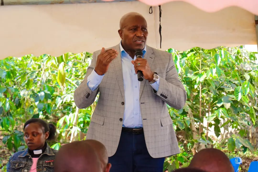 Embu County Deputy Governor Justus Kinyua Mugo addresses the public during the mourning of Justin Munene at his home in Gakwegori.